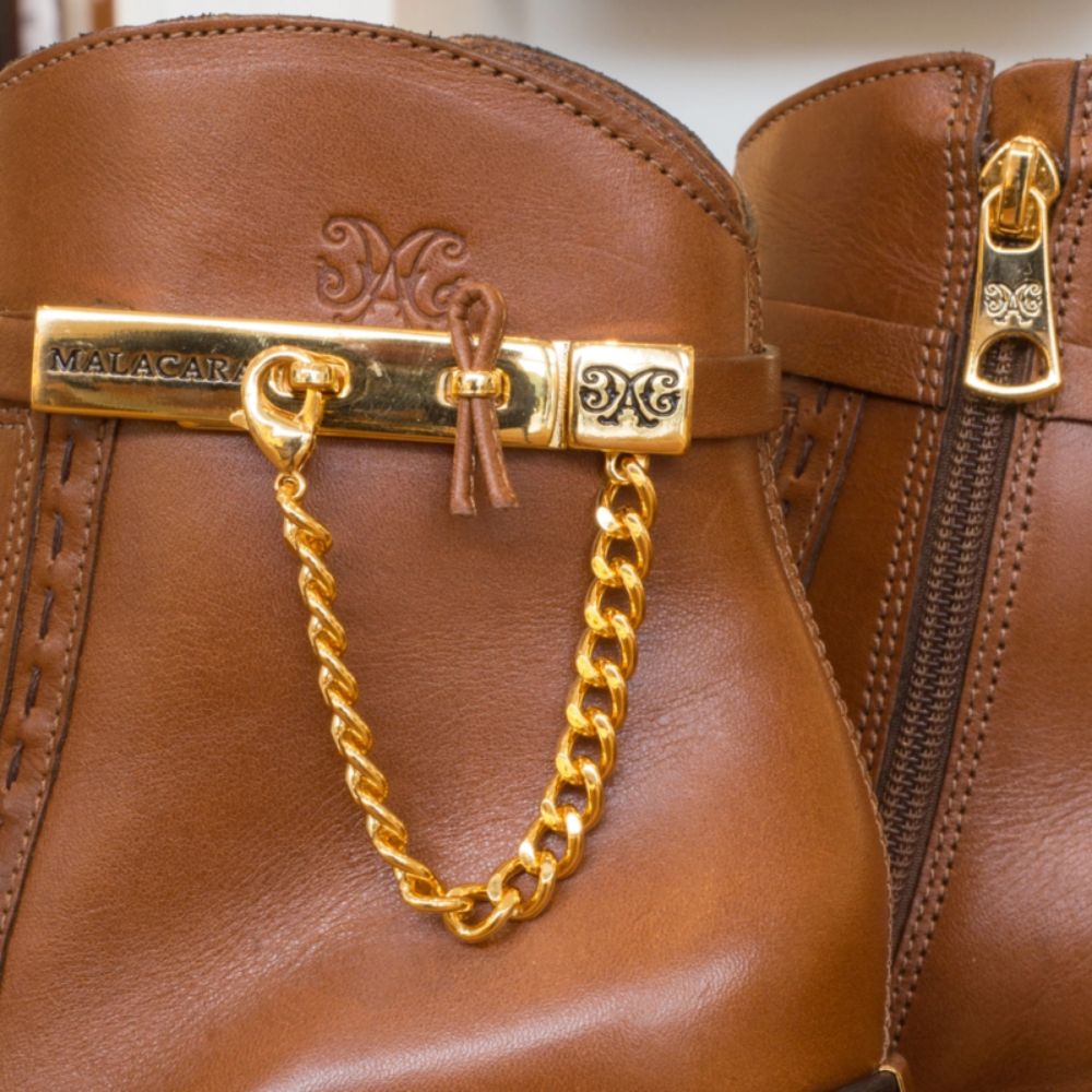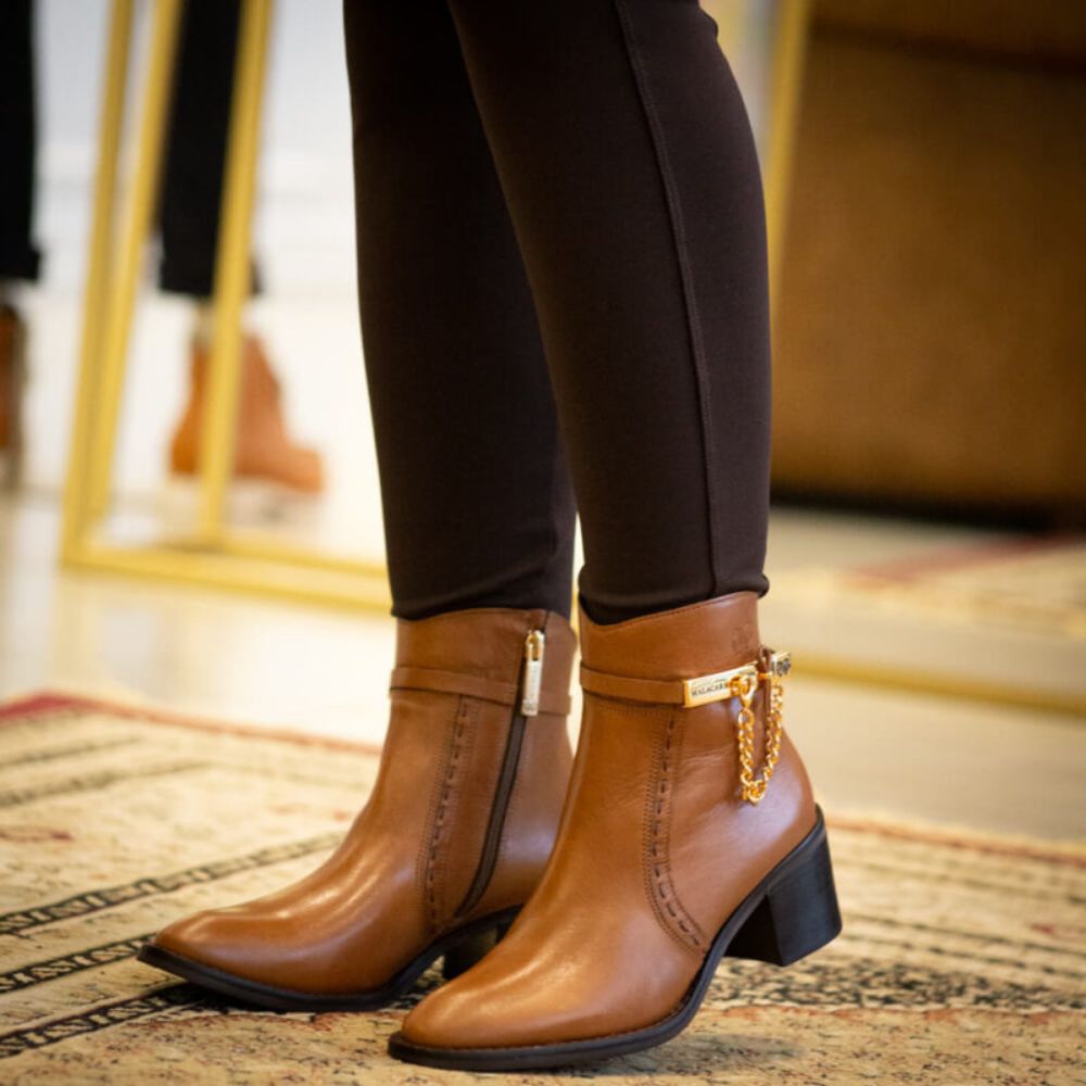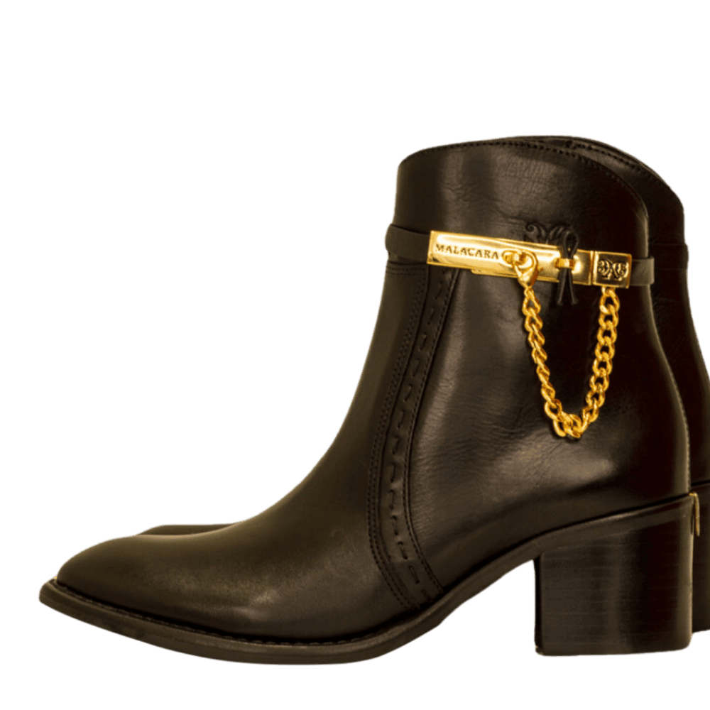 Its short shaft and versatile design make it an essential piece for any wardrobe, ideal for those looking for timeless and functional footwear. The touch of refinement comes from the side detail in a gold chain, which adds a subtle and refined charm to the model.