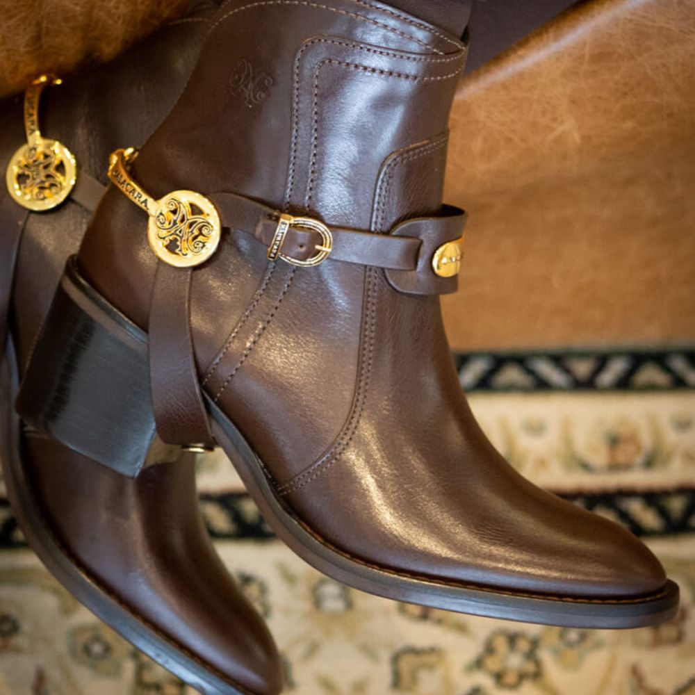 The practicality of the short shaft and the removable metal are the hallmarks of this piece. Made entirely of leather, it bears the Malacara signature on the gold metal that surrounds the heel and on the stamps carefully positioned on the upper part of the shaft. The soft lining on the inside and the traditional compay heel complete the look and ensure the brand's signature comfort.