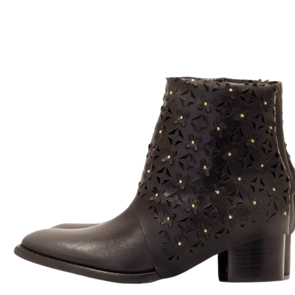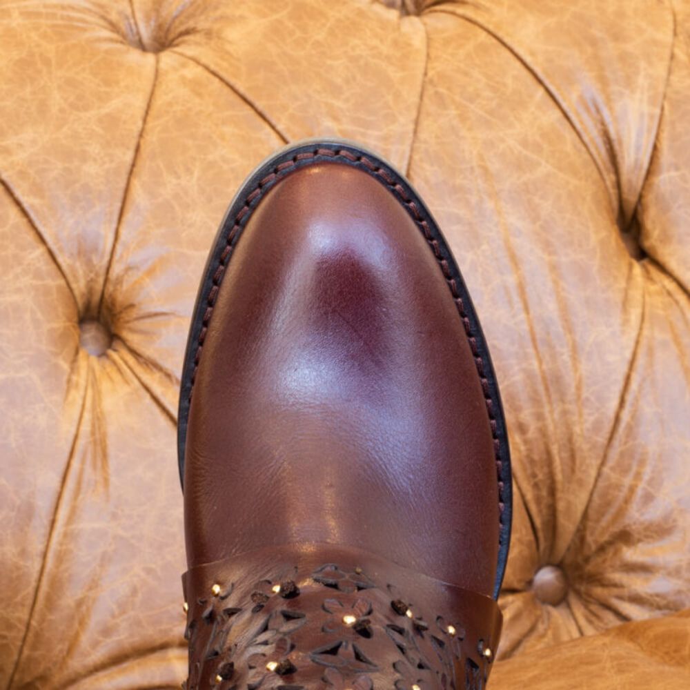 The Rosaflor Boot, made of leather with laser cutouts and studs, combines refined craftsmanship and innovative design. The precise cutouts create a modern and unique pattern, while the studs add a touch of personality. Every detail reflects the artisanal skill and care taken in production, resulting in a model that combines tradition and contemporaneity with authenticity.