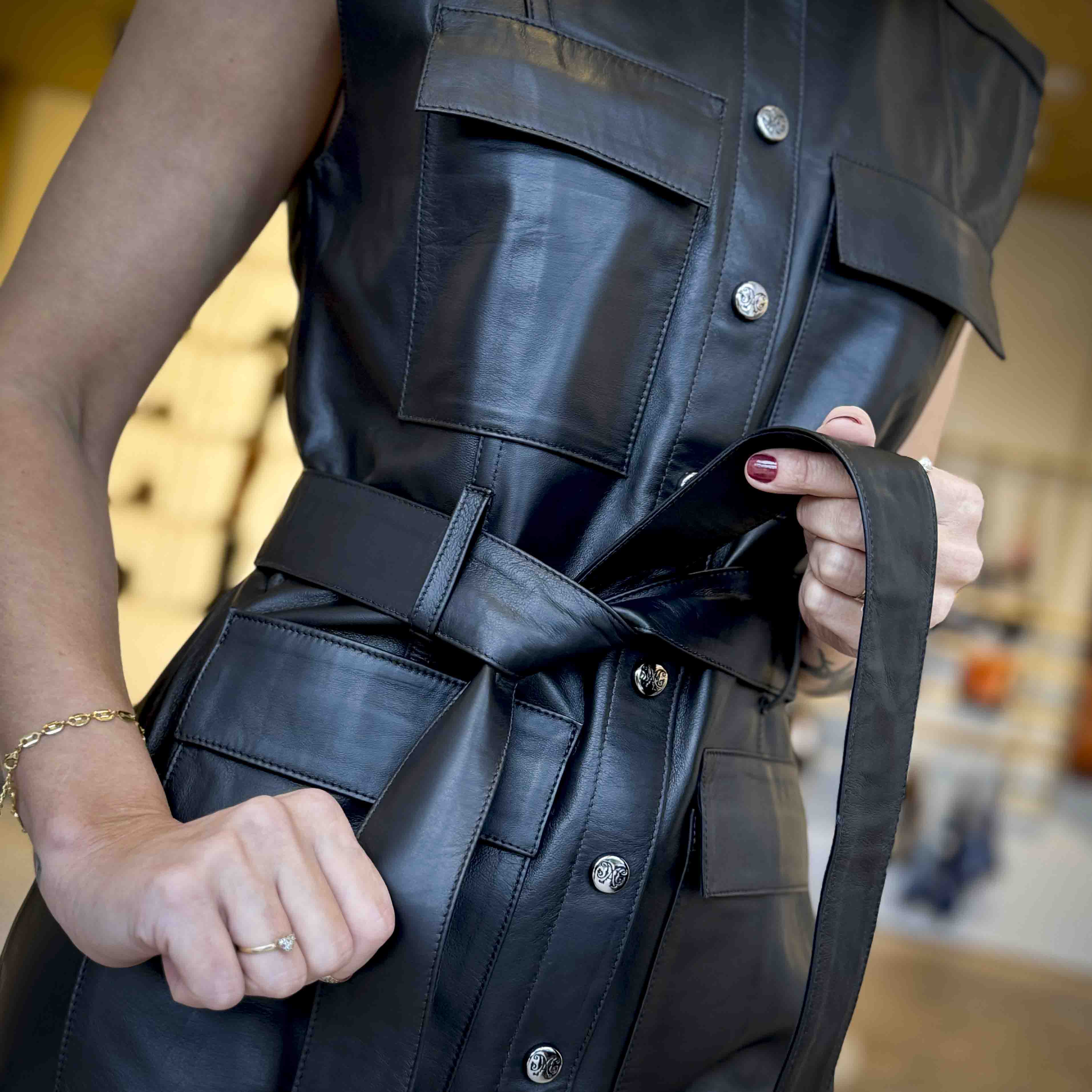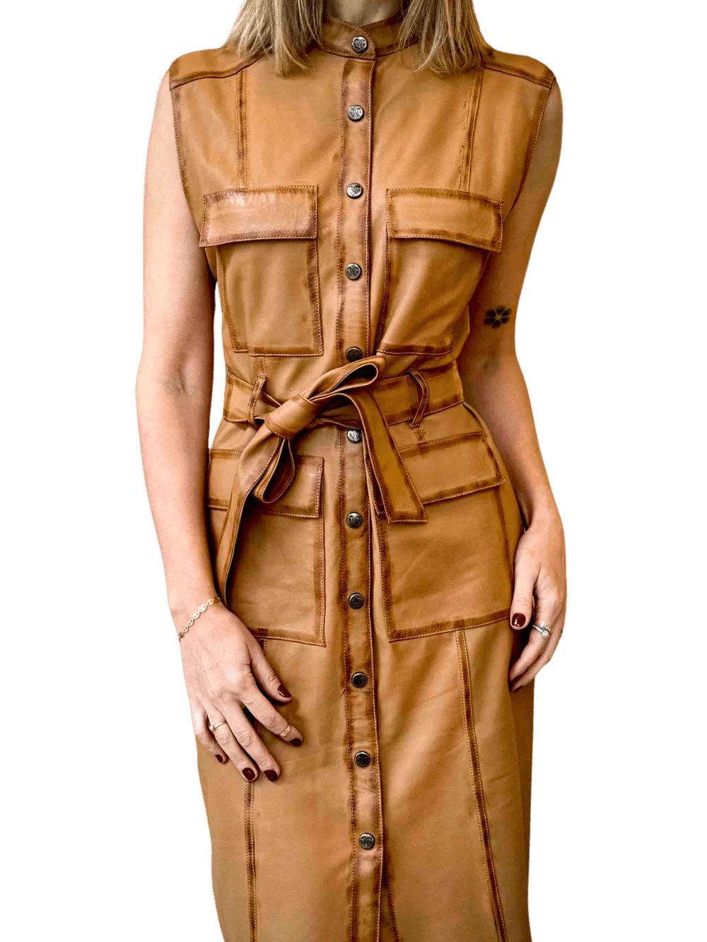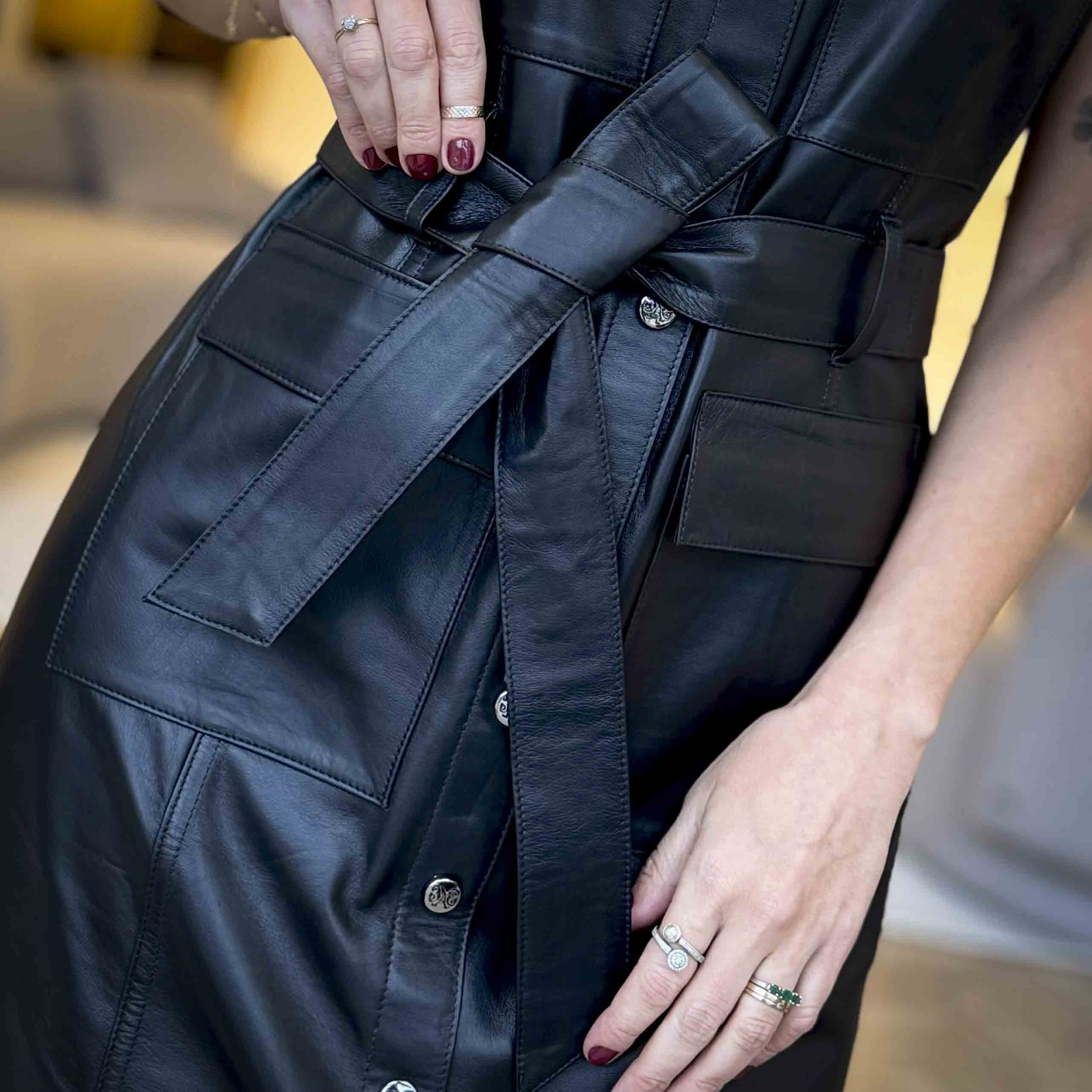 The Estate Goatskin Leather Dress is a versatile and stylish piece, ideal for a variety of occasions. Made from high-quality calfskin, this dress combines elegance and durability, providing a sophisticated and modern look.