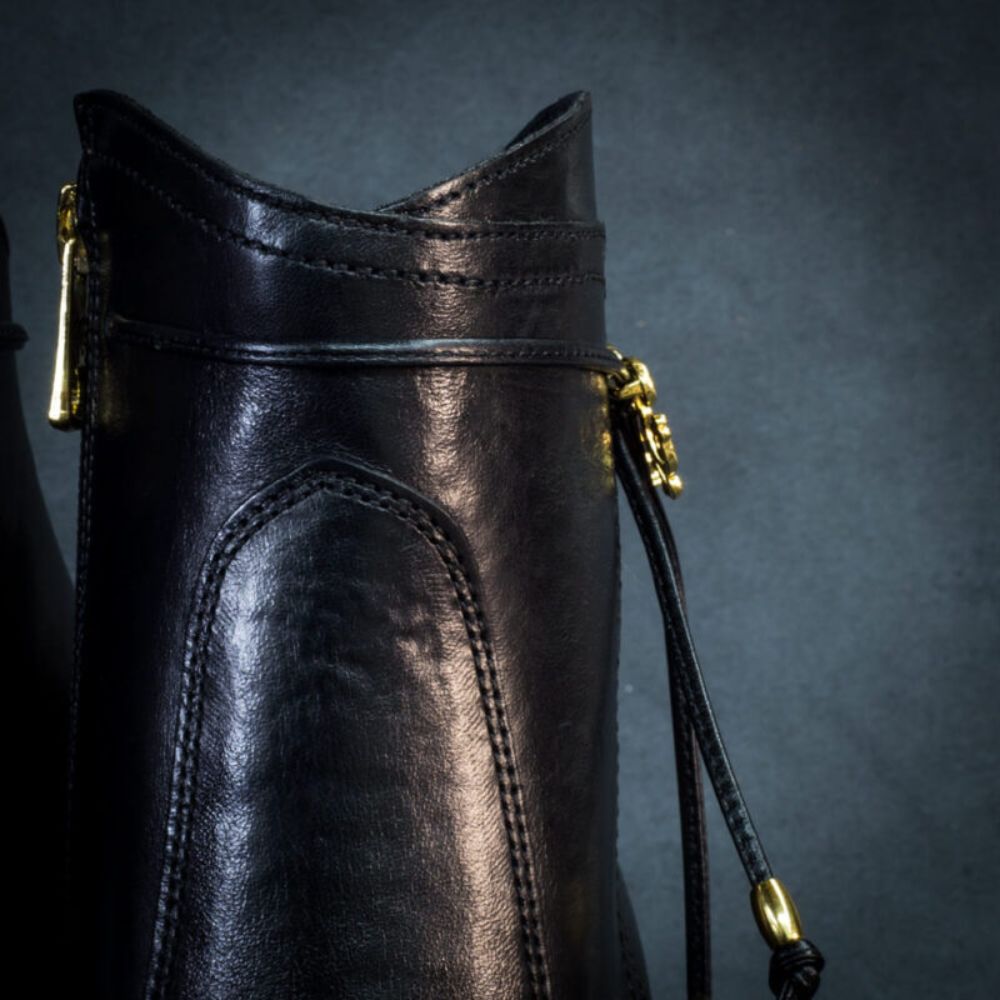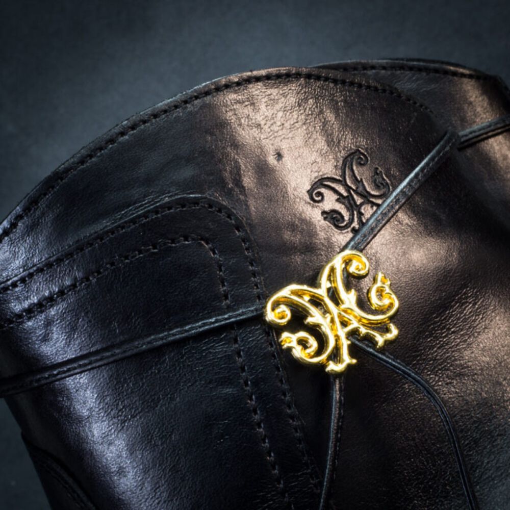 Made entirely of leather, the piece features a delicate metal on the outer side of the shaft that is the signature of the piece.