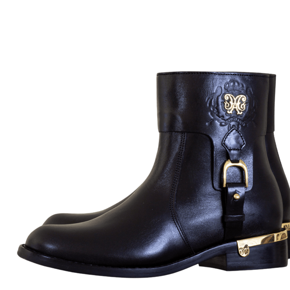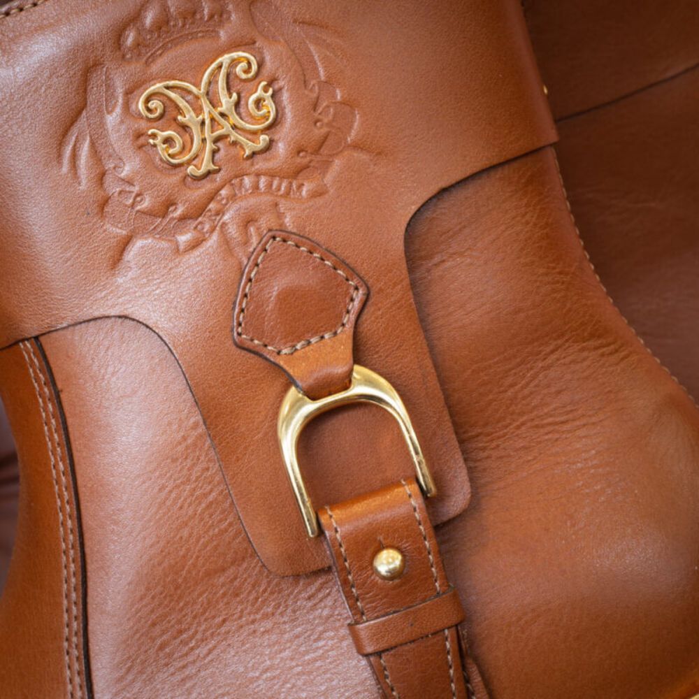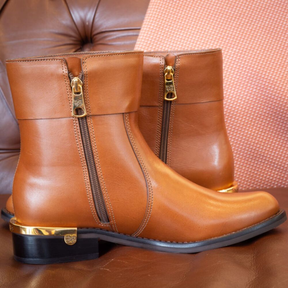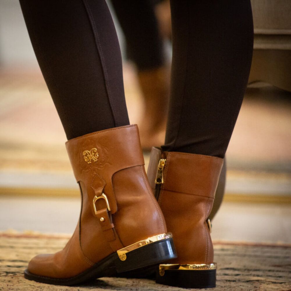 The Stirrup Boot combines style and comfort in a design inspired by the Sincerro model. With an internal zipper for easy fitting and a cozy lining, it stands out for its gold metal heel and the stirrup detail, paying homage to riding boots. The brand's signature on the shaft reinforces its authenticity and charm.
