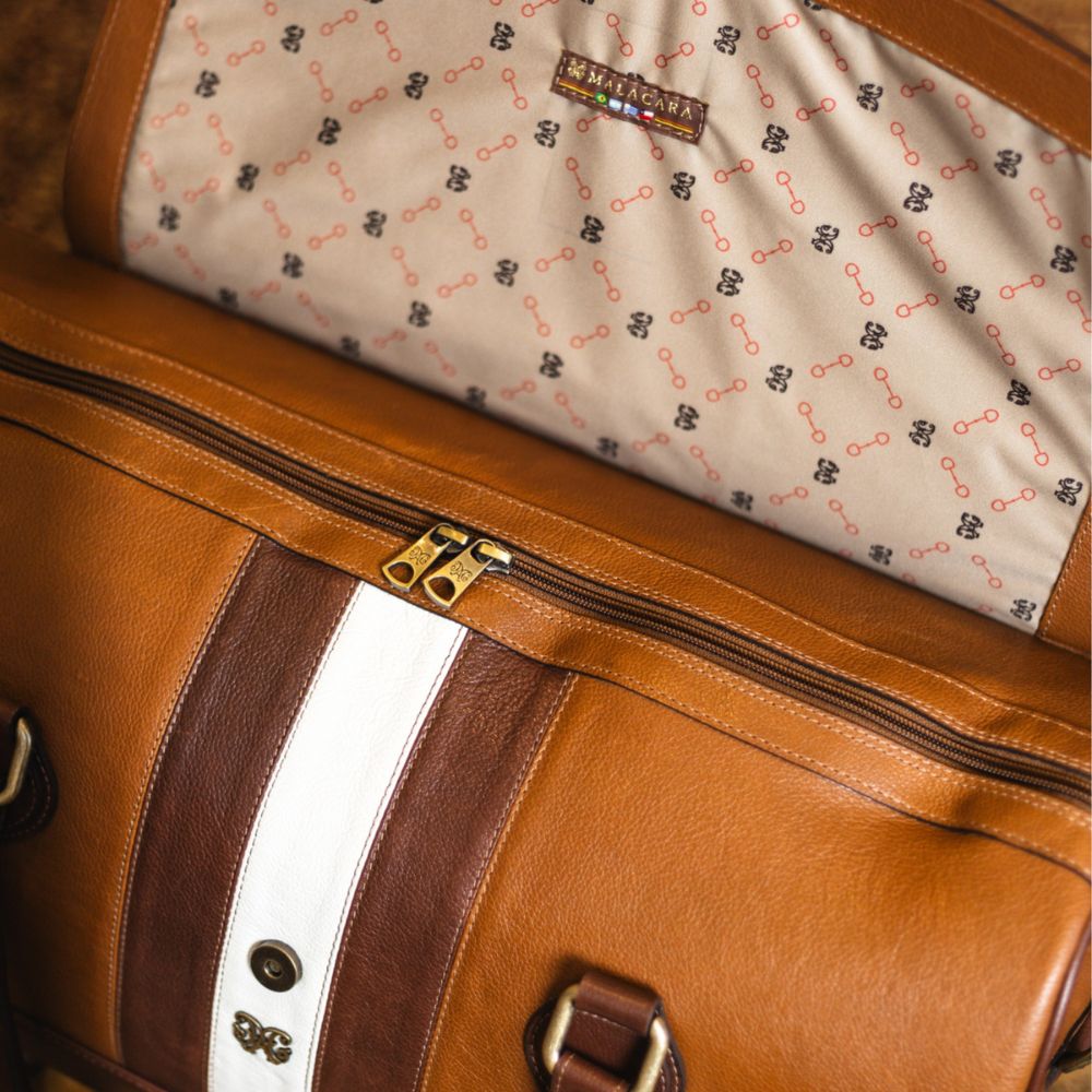 The zipper closure ensures practicality and security, and the highlight is the metal front with the Malacara logo, which reinforces the brand's identity in a sophisticated way. With antique gold metals, the suitcase exudes a refined finish, complementing its robust and elegant design.